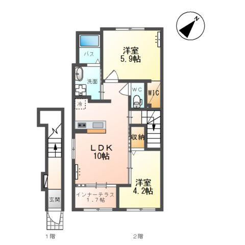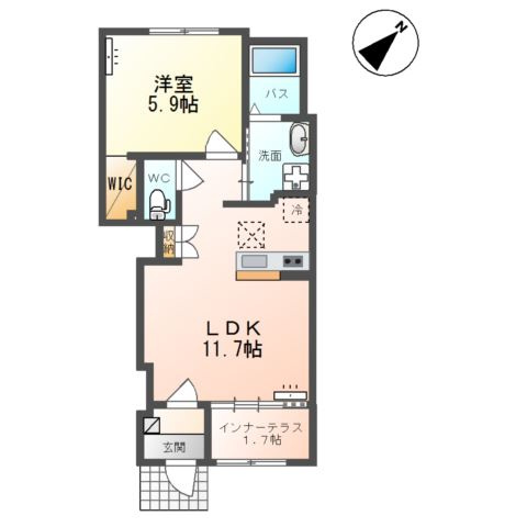 洋室 5.9帖 1室/LDK 11.7帖 1室 - 向き